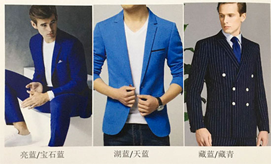 藍色被認為是男士穿著率最高的顏色,藏青色對男士來說是永遠的基本色,所以把它排在男士著裝的三原色之首,其它二色便是灰色和茶色,所以生活中基本上每個男士都會有幾套藍色系的西服。