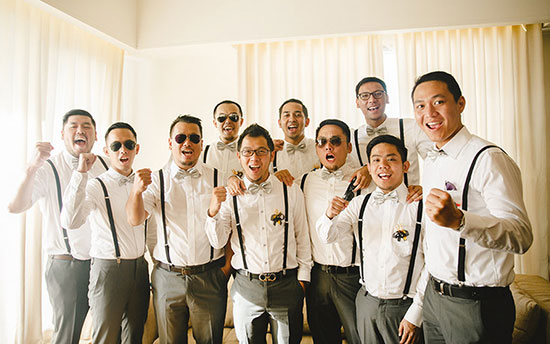如果不是選擇在寒冷的冬天舉行婚禮,伴郎可以不需要將西裝都穿在身上,這時(shí)候可以把外套去掉,留下白色襯衫和領(lǐng)結(jié)即可。這樣的穿搭也是比較適合氣溫暖和的天氣,這樣也可以讓婚禮的主題偏輕松自然。伴郎的襯衫配上新郎簡潔大方的西裝,由于伴郎的服裝偏休閑,新郎的偏正式,這樣才能凸顯新郎的主角位置,同時(shí)也可以讓伴郎展示出他們兄弟間的獨(dú)特風(fēng)采。