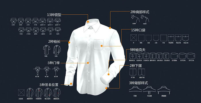 定制襯衫可以自行選擇自己喜歡或所需的面料,款式也可以進行任意的設計,紐扣、門襟、袖扣等都可以按要求制作。