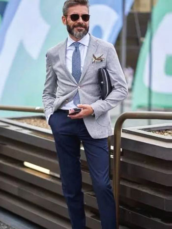 2、灰色西裝下搭藏青西褲+棕色皮鞋更顯商務(wù)休閑氣息,領(lǐng)帶選擇藍(lán)色款與褲子的色彩呼應(yīng)更有造型感。