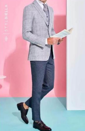 3、淺灰色格紋單西配藏青色系的小西褲+格子領(lǐng)帶,這種搭配對(duì)于個(gè)子高,身材不顯胖的男士來說更具優(yōu)勢(shì),給人一種十分優(yōu)雅的感覺。