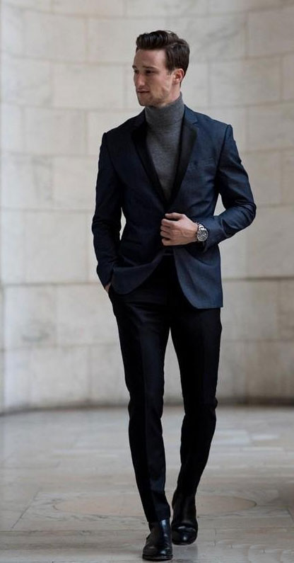 3、深藍色單西內搭毛織衫+休閑黑色窄腳褲;可以多重提升并塑造出紳士的格調,同時于沉穩(wěn)中見品味,不但展現自信,也顯儒雅的氣質。