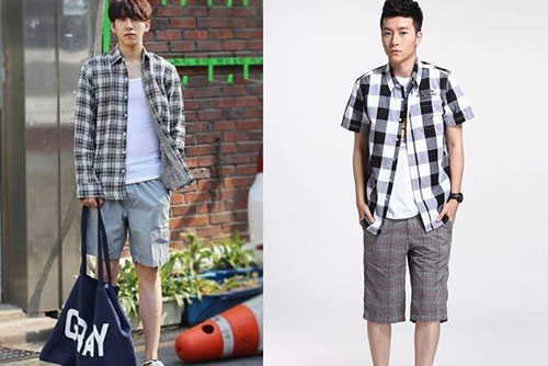 無論哪個顏色的格子襯衫內搭都可以與白色的T恤相搭配,T恤可以是純白色,或選擇有圖案的都可以,再配上一條休閑短褲,休閑又大方。