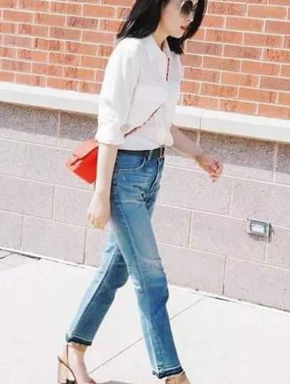 2.純色襯衫和牛仔褲搭配。當(dāng)溫柔淑女氣質(zhì)的純色襯衫遇上休閑青春的牛仔褲時,兩者之間摩擦出來的是既休閑氣質(zhì)又很時尚的時髦穿搭。純色襯衫和牛仔褲搭配,在配上運動鞋或小白鞋,即可以瞬間將人帶入青春的記憶,具有青春的活力。這種搭配非常適合學(xué)生聚會,去玩和約會。