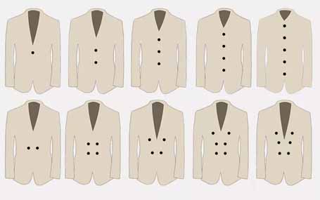 常見(jiàn)的西裝門襟有兩種疊門方式,單排疊門或雙排疊門,仔細(xì)想來(lái),看似選擇的是不同的疊門方式,實(shí)際上,起決定性作用的反而是扣位的安排,也就是說(shuō),我們選擇的是把紐扣釘在哪,扣位決定了西裝最終會(huì)呈現(xiàn)出什么樣子。西裝的扣位安排,最常見(jiàn)的方式可能包含單排一粒扣、單排兩粒扣、單排三粒扣、雙排六扣二、雙排六扣一、雙排四扣二等,更多可參考下圖。西裝領(lǐng)型、兜型、單雙開(kāi)叉等都會(huì)引起西裝形的變化,但沒(méi)有一個(gè)比扣子對(duì)西裝造型的影響更為深遠(yuǎn)。